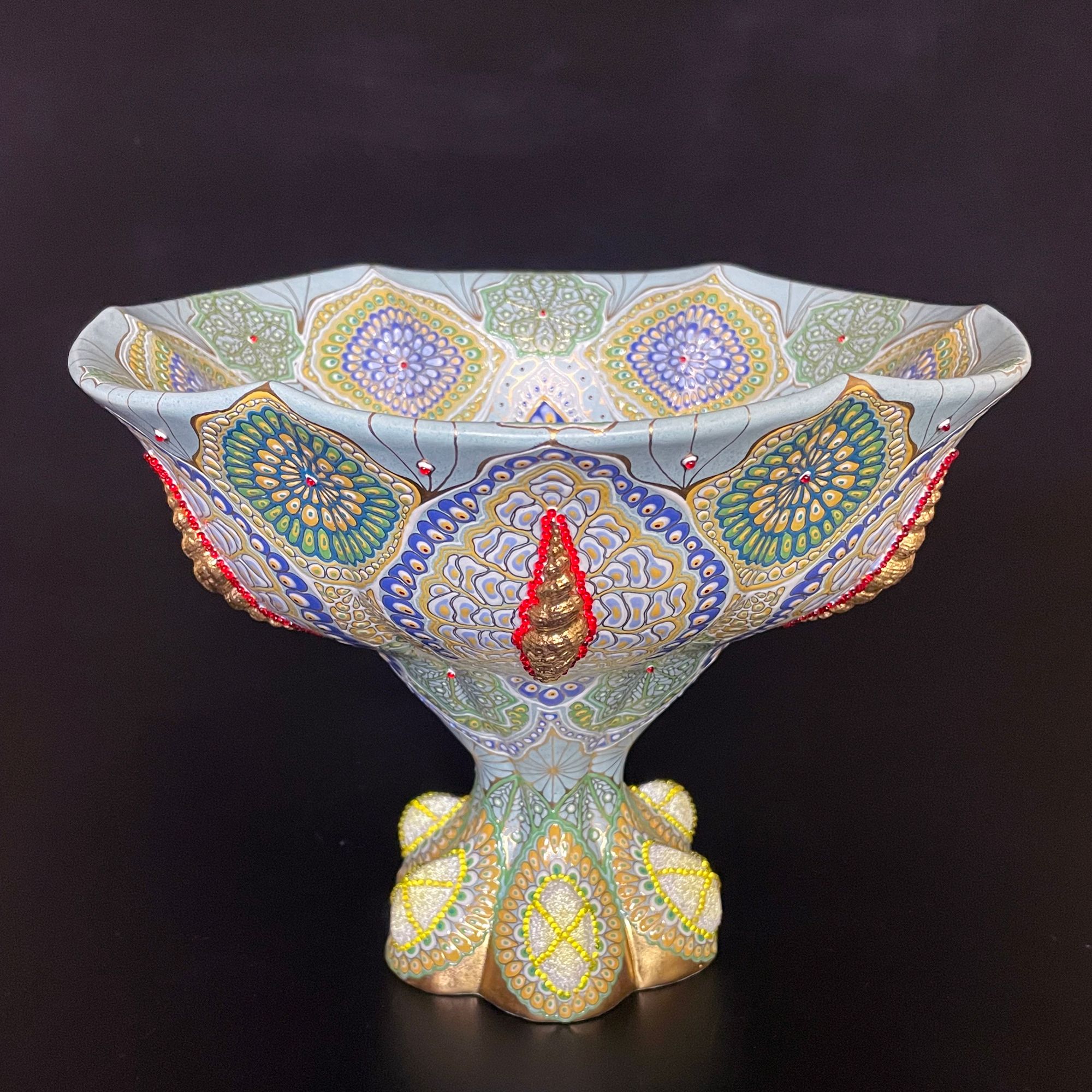 He finds photographs of buildings around the world, vast landscapes, interesting creatures, people, ordinary utensils, and food, and paints them exactly as he sees them, with single-minded precision. The countless shades of green are particularly beautiful. He perceives red and green as the same color, so blue-and-white porcelain pots appear as a soft pink, and people’s faces appear as a light green.