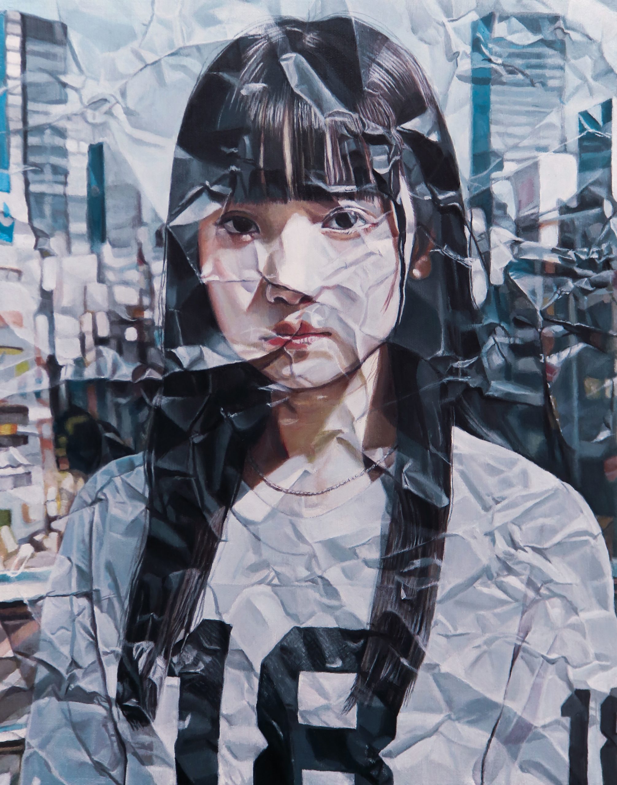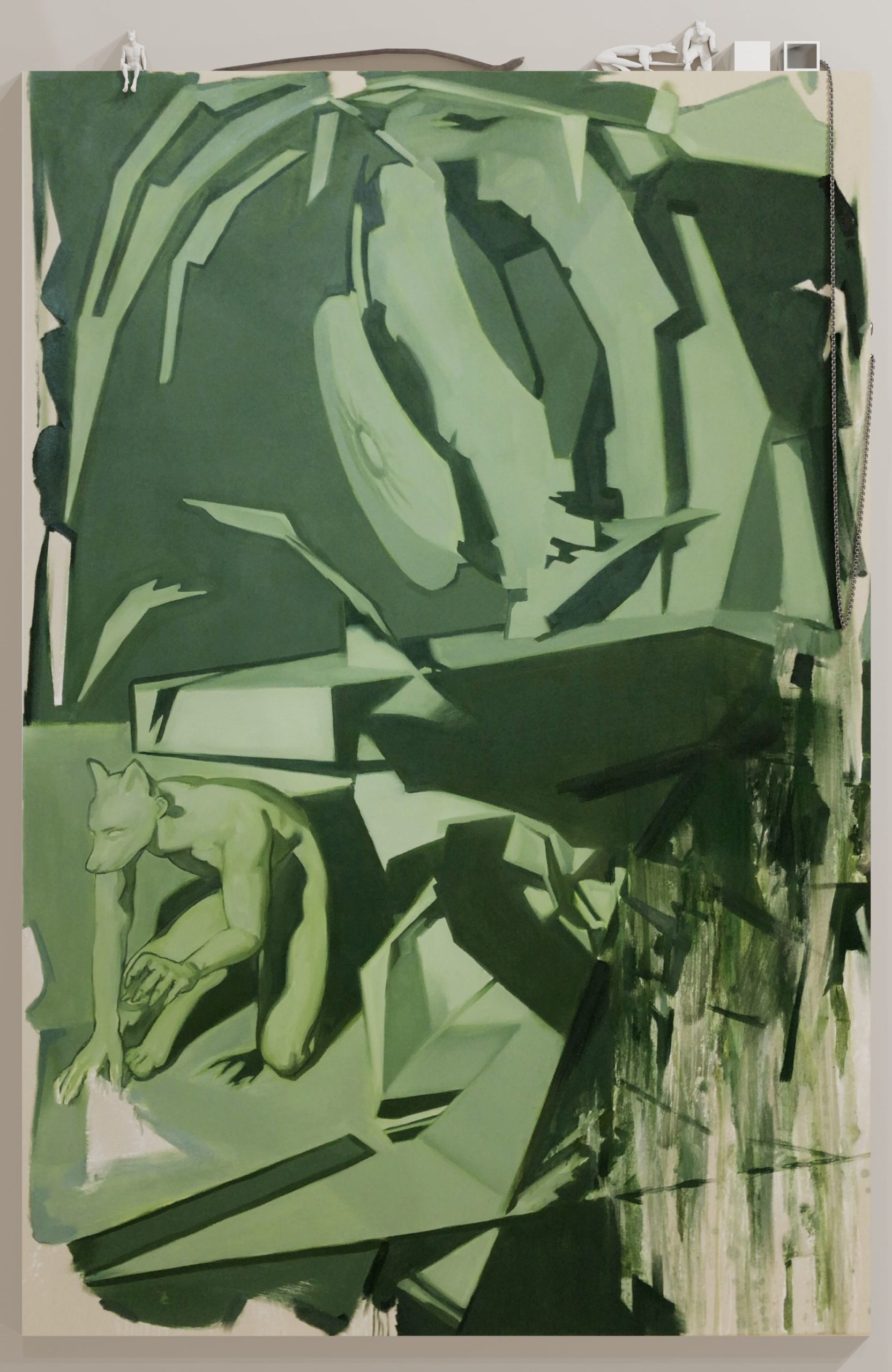 キャンバスに油彩、鉄製クロ ムメッキチェーン、PLA樹脂