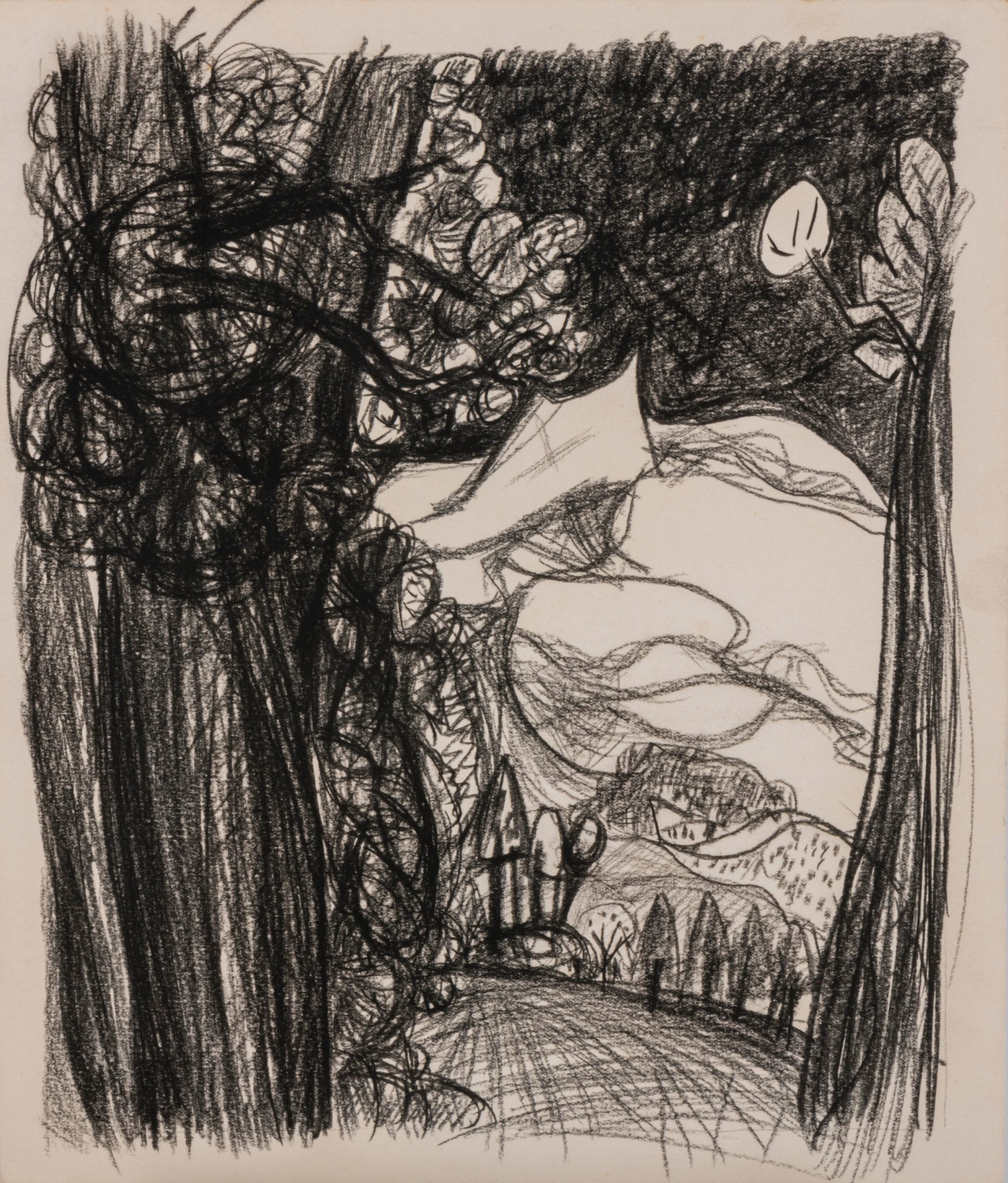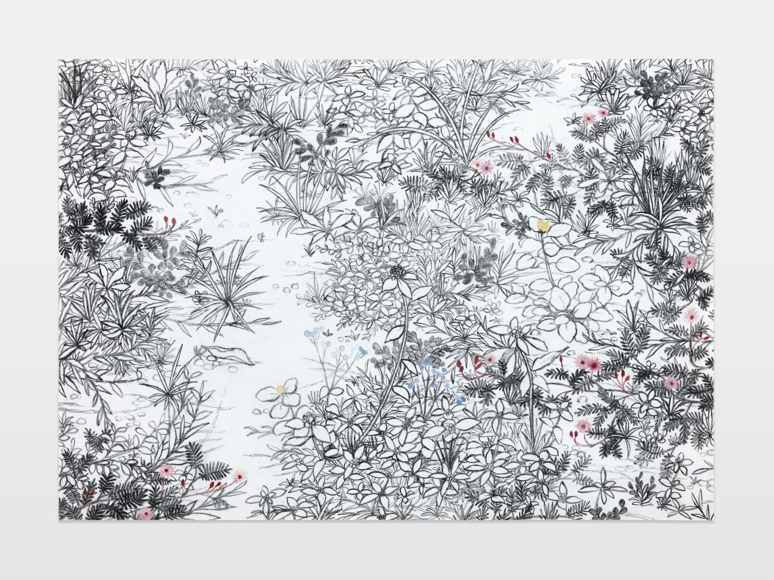 各々のモチーフを個別に克明にとらえ、陰影がない平坦な景色の組み合わせにより、パースペクティブは独特なゆらぎと絶妙なリアリティをかもしだしています。ところどころ水彩で着彩された部分は、須藤の印象に残った箇所であり、そのモノクロとカラーの両立は、観る者の想像力をより駆り立てるでしょう。